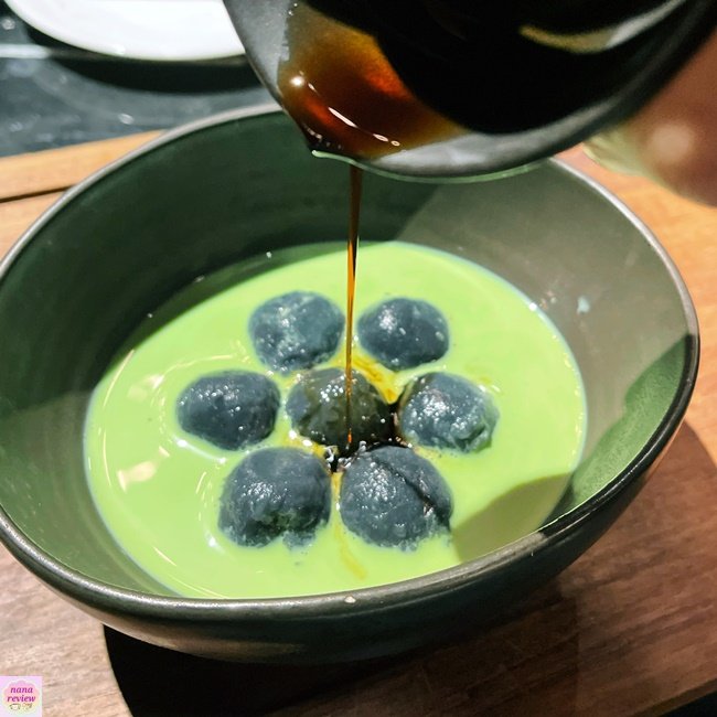 โมจิไส้ถั่วแดง ซอสชาเขียว เติมน้ำเชื่อมที่ให้มาก็จะหวานหอมเบาๆ ดีงาม ค่ะ