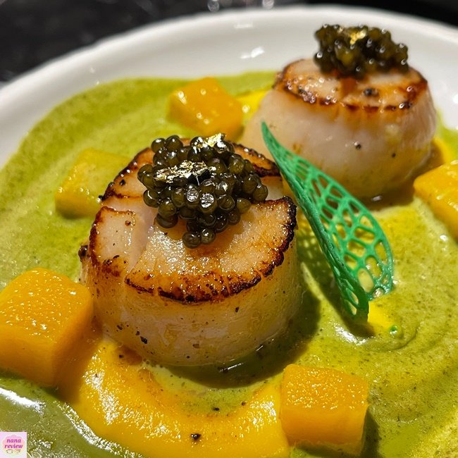 หอยเชลล์ย่างเสิร์ฟพร้อมซอสชิโสะ และ คาเวียร์ ฟินมากๆ หอยเชลล์ ตัวโต สด หวาน อร่อย กินกับซอสไตล์ผลไม้เบาๆ ไม่แรง ไม่กลบหอยเชลล์จ้า