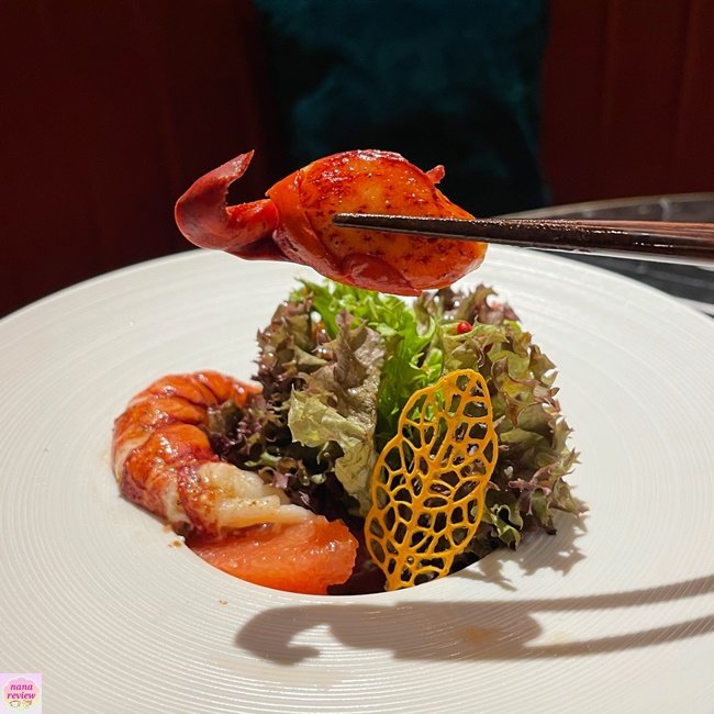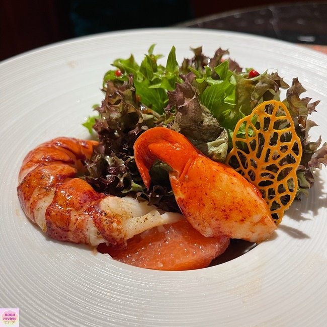 สลัดกุ้งล็อบสเตอร์ สดชื่นกับน้ำสลัดยูสุแบบญี่ปุ่นพร้อมเนื้อ Lobster ครึ่งตัว กับก้ามอีก 1 ก้าม ในถ้วยผักสลัดและส้มโอ เรียกน้ำย่อยได้ดี