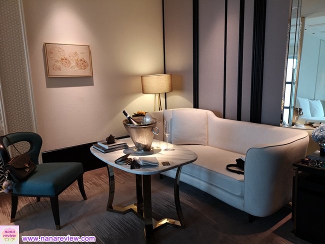เข้ามาเจอกับที่นั่งใส่รองเท้า เดินไปทางขวาเป็นโซฟาเล็กๆ มี Sparkling Wine แช่รอไว้ให้แล้ว (รวมอยู่ในโปรโมชั่นที่จองมาค่ะ)