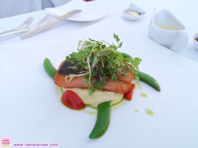 ปลาแซลมอนแทสมาเนียนนาบกระทะซอสเลมอนบัตเตอร์ (Pan seared Tasmanian Salmon, coriander mashed potatoes, lemon butter sauce)
