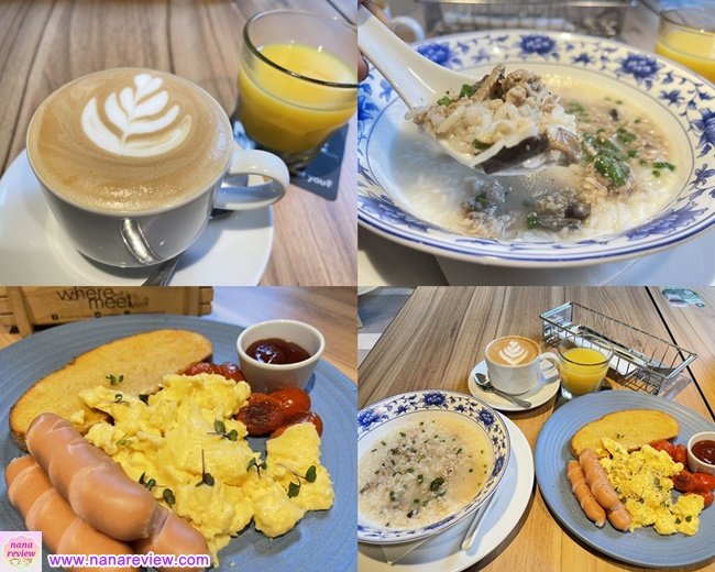 มื้อเช้าจะมีอาหารเช้าเป็น Set ไข่กับขนมปัง หรือ ครัวซองส์ หรือ ข้าวต้มให้เลือก พร้อมเครื่องดื่มค่ะ