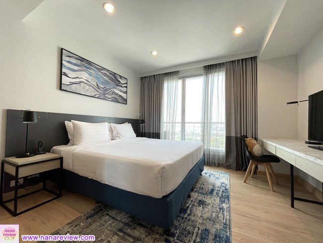 ห้องนอนที่ 1 เป็นเตียง King Size พร้อมวิว Lakeview คือ ทะเลสาบที่มองเห็นที่ศูนย์สิริกิติ์ นั่นเองจ้า ในห้องนอนนี้มีตู้เสื้อผ้า โต๊ะอ่านหนังสือ และมีห้องน้ำ 1 ห้องค่ะ มีอ่างอาบน้ำขนาดใหญ่ด้วย