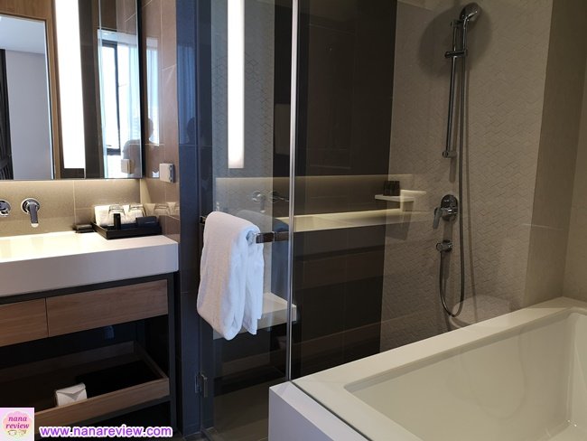 ห้องน้ำมีส่วนอาบน้ำ และ อ่างอาบน้ำ พื้นที่ลงตัวดีค่ะ