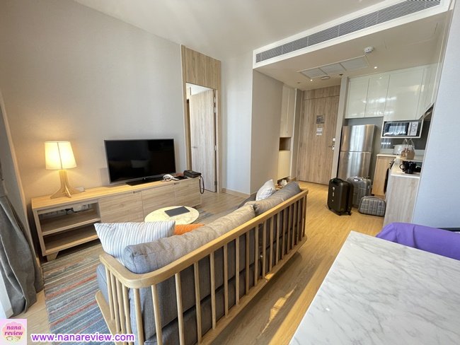 ห้องที่ได้เป็น Type Premier Apartment นะคะ ขนาดกำลังดี ไม่รู้สึกว่าเล็กนะ ทั้งที่แบ่งห้องเป็นส่วนๆ เข้ามาจะเจอกับโซฟา โต๊ะเล็กๆ สำหรับนั่งกินข้าวได้ และ เครื่องซักผ้า ตู้เย็นขนาดใหญ่ เคาน์เตอร์และอุปกรณ์ทำครัว