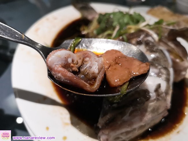เชฟจะแยกตัดปลาเก๋า และ กะเพาะปลาเก๋าไว้ข้างๆตัวด้วยนะคะ ให้รู้ว่าสดจริง ชำแหละเองจริงค่ะ และสำหรับคนที่ชอบกินส่วนนี้ด้วยค่ะ