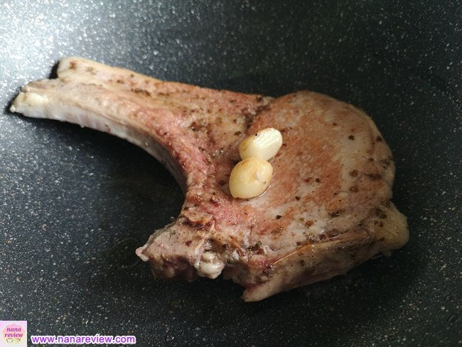 พอกระทะร้อน วางชิ้นสเต็กลงไป 3-4 นาที แล้วพลิกอีกด้านต่ออีก 3-4 นาที สเต็กจะสุกถึงด้านใน
