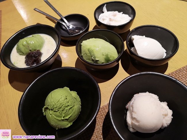 ผลไม้รวม ,ไอศกรีม , พุดดิ้ง และ ไอศกรีมชาเขียวโมจิถั่วแดง