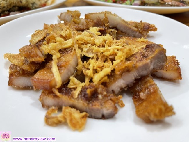 หมูสามชั้นทอด มีโรยกระเทียมกรอบมาให้ด้วย ดีงาม