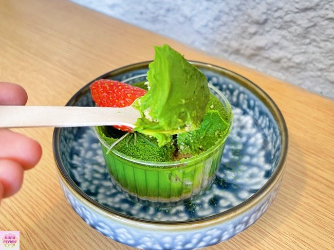 ตัวมูสชาเขียวแบบเข้มข้นแต่ไม่ขมนะคะ เนื้อเนียน ละมุน ไม่หวาน ฐานเป็นครัมเบิ้ลเนื้อละเอียด ด้านบนตัดรสด้วย สตอร์วเบอร์รี่ ได้ความสดชื่น (บางวันอาจจะเป็นราสเบอร์รี่นะแล้วแต่วัตถุดิบที่มี)