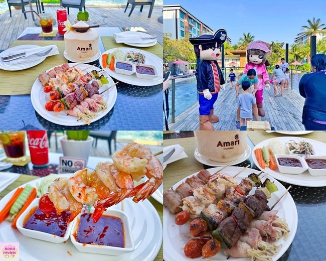 Aqua Pool Bar บาร์สุดชิคริมสระว่ายน้ำ นอกจากมีบริการเครื่องดื่มและของว่างแล้ว ทุกวันศุกร์และเสาร์ ประมาณ 4 โมงเย็น ยังมีบาร์บีคิว ราคาประหยัด เริ่มต้นไม้ละ 60 บาท ให้บริการด้วยนะคะ ขายดีมากๆจ้า คือ ไม่แพงอ่ะ มีให้เลือกทั้ง หมู ไก่ กุ้ง หรือ ลูกชิ้นไม้ละ ไม่เกิน 20 บาทค่ะ จัดไปเลย ลูกสาวชอบน้ำจิ้มรสกลางๆ ไม่เผ็ด เด็กกินได้ค่ะ