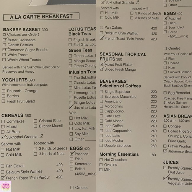 และอันนี้คือใบรายการอาหารเช้า ที่พนักงานแจ้งว่าเลือกได้ทุกอย่าง เสิร์ฟไม่อั้น แต่ให้แจ้งไว้ทีเดียวไปเลยเพื่อการบริหารจัดการที่ครบถ้วน แต่ถ้าไม่พอก็สามารถเพิ่มได้ค่ะ