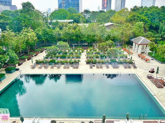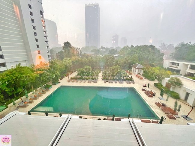 วิวเมื่อมองลงไปเห็นสระว่ายน้ำ คือ สระที่นี่ใหญ่มาก น่าว่ายน้ำสุดๆ แต่ก็ได้แต่มองนะ ว่ายน้ำไม่ได้ค่ะ ปิดตามมาตรการ Covid-19 สักพักฝนตก แฮ่ๆ