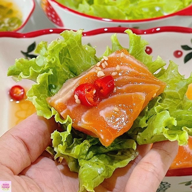 หลังจากซอสเย็นแล้วก็มาราดปลาแซลมอน โรยกระเทียม และ พริก ปิดฝาใส่กล่องแช่ตู้เย็น 6 ชั่วโมง หรือ 1 คืนจ้า