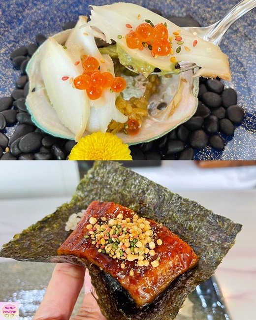 ต่อด้วยข้าวปั้นหน้าเป๋าฮื้อ และ ซอสหอยเป๋าฮื้อ และ ข้าวปั้นหน้าปลาไหลย่าง