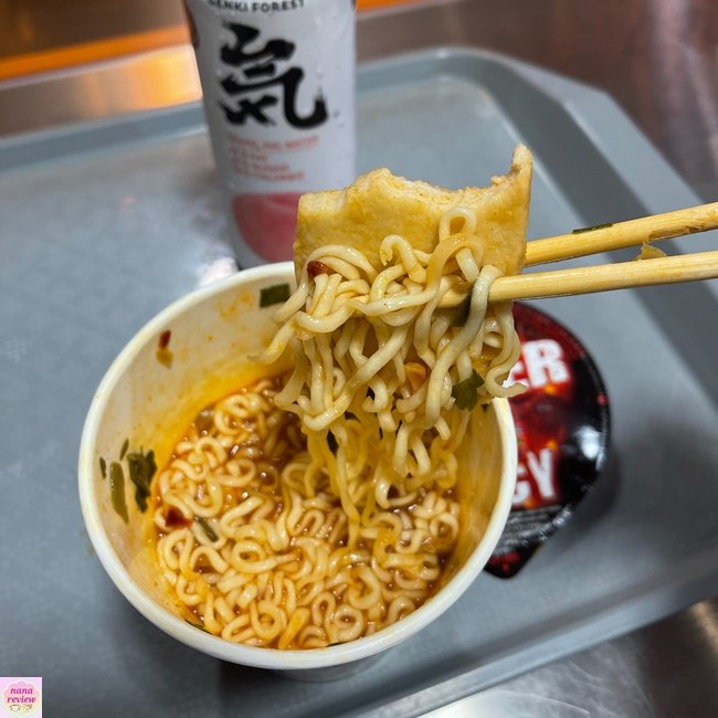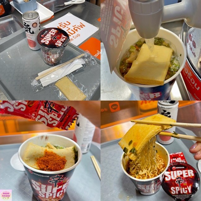 เรานี่เลือกถ้วยเล็ก ของเกาหลี แบบเผ็ด 5/5 เลย ซื้อลูกชิ้นปลาเพิ่ม 1 แผ่น พอเดี๋ยวล้นถ้วย ซื้อน้ำพีชโซดาอีก 1 กระป๋อง หมดไป 95 บาท นั่งซดฟินๆจ้า