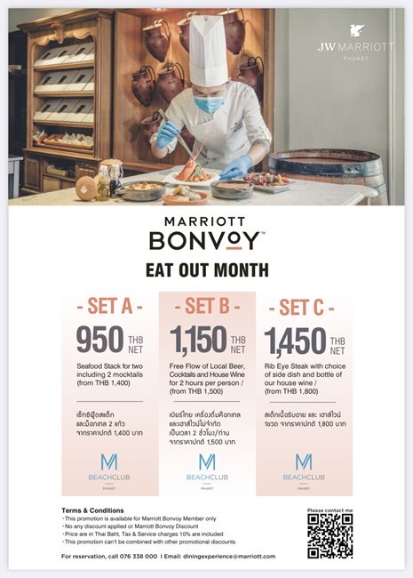 สำหรับข้อมูลเพิ่มเติมเกี่ยวกับ โปรแกรม “Eat Out with Marriott Bonvoy” และการจองมื้ออาหารของคุณในประเทศไทย ดูที่ลิ้งนี้นะคะ