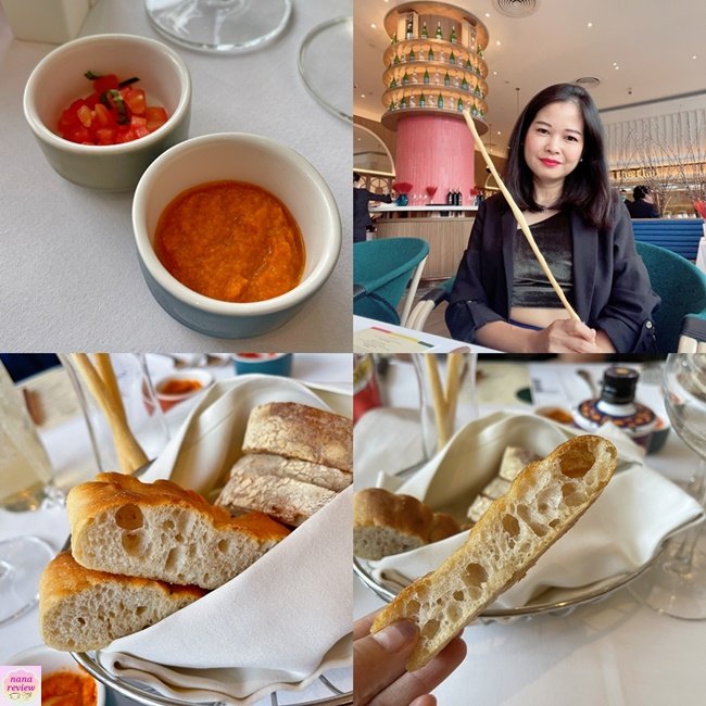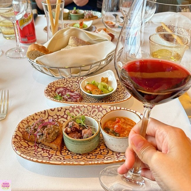 ตับไก่บนขนมปัง sourdough , ซาลามี่ , ซุปมะเขือเทศ , สลัดแตงกวา+มะเขือเทศ และ หนวดปลาหมึกตุ๋นไวน์แดง