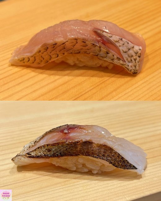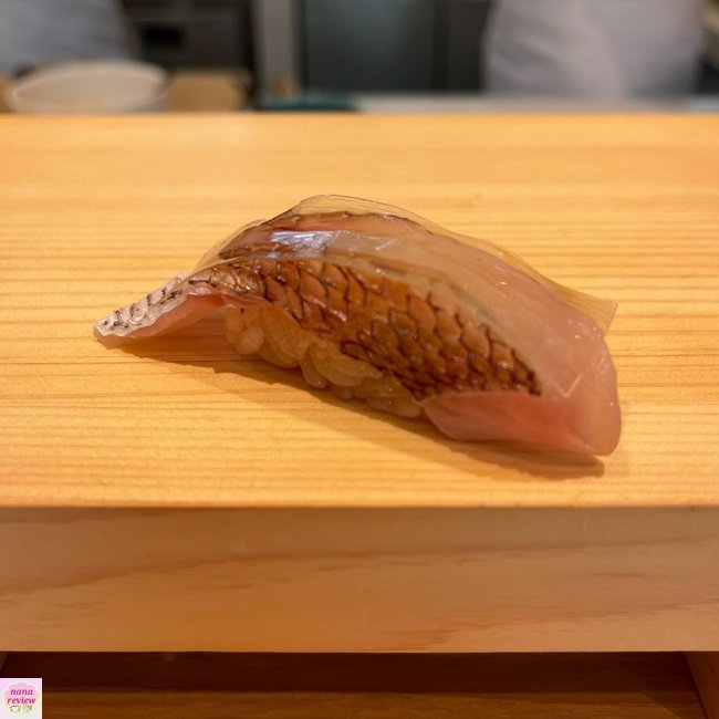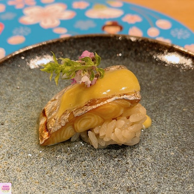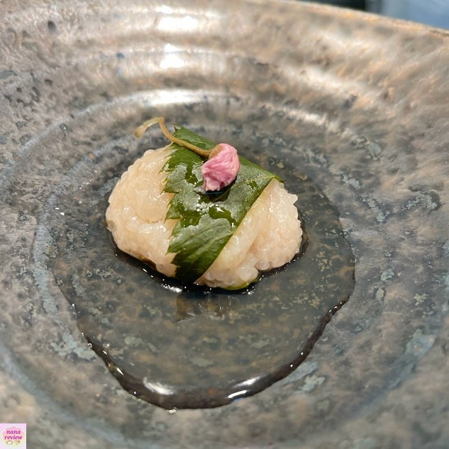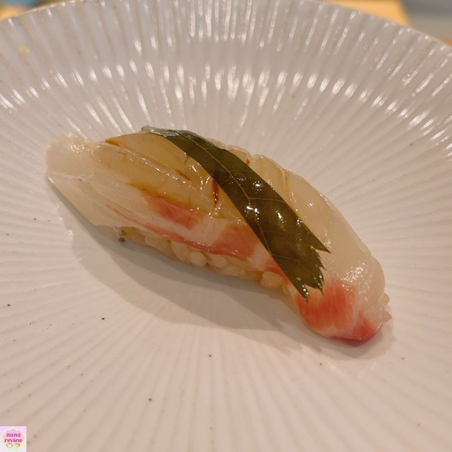 คำนี้เป็นซูชิปลาเนื้อขาวกับซอสและใบซากุระค่ะ