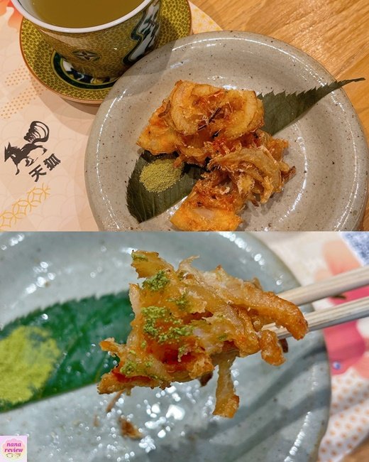คอร์สอาหารเป็น กุ้งทอด กับผงเกลือชาเขียว เสิร์ฟกับชาร้อนค่ะ