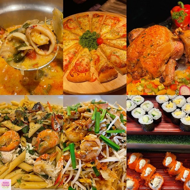 อาหารอินเตอร์มากมาย เช่น ไก่อบ/ซี่โครงหมูอบ , สเต็กปลา , ต้มยำทะเล , ผัดไทยกุ้ง , พิซซ่า , สปาเก็ตตี้ทะเล , ฯลฯ