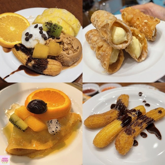 เค้ก , เครป , ไอศกรีม , ชูโรสทอดอุ่นๆเลย และผลไม้สด