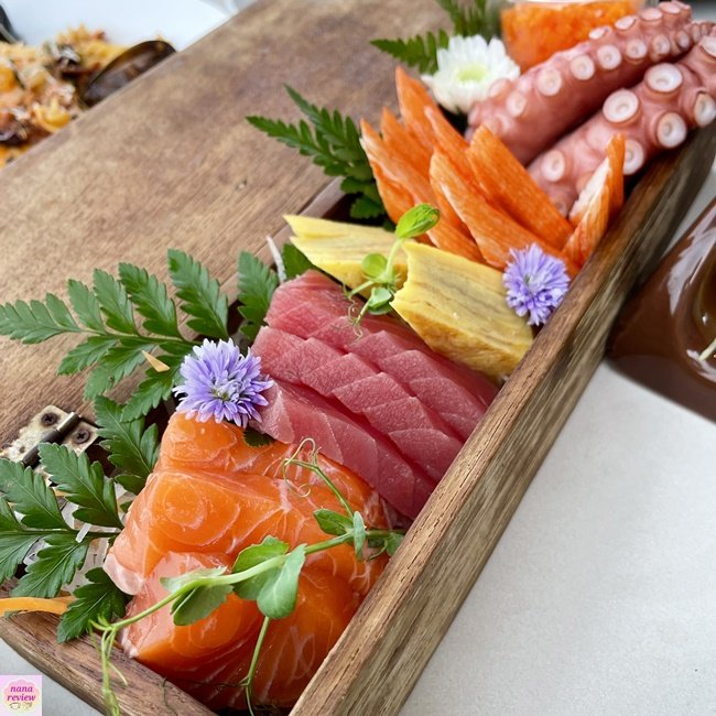 มีเนื้อปลาแซลมอน , เนื้อปลากะพงห่อใบตองย่าง, กั้งกระดาน, ปลาหมึก, กุ้งแม่น้ำ ว้าวมากๆเลย สดทุกตัวจริงๆ
