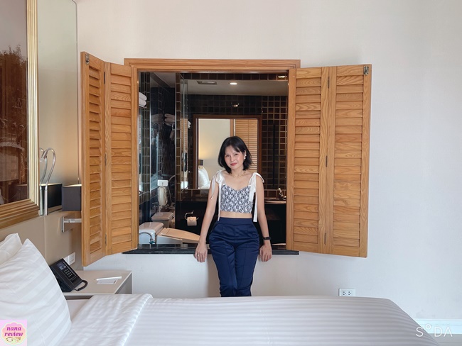 ตกแต่งเรียบหรู โทนสีน้ำตาลทอง มีหน้าต่างไม้